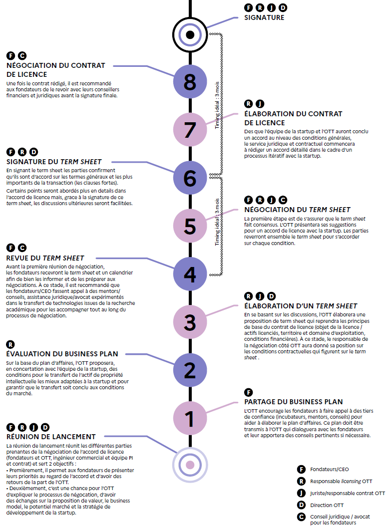 Sans licence, la propriété intellectuelle issue d’un laboratoire de recherche ne peut pas être exploitée commercialement. La licence est donc un outil juridique puissant et incontournable pour mettre sur le marché les produits et services issus de la technologie / du savoir-faire et éviter d'être contrefacteur pour l'entreprise. Une pré-version de ce contrat de licence est souvent appelée "Term Sheet" : c'est un document court synthétisant les principaux accords obtenus à l’issue d’un premier tour de négociation entre l'entreprise et l'OTT. Ce document ne constitue pas un engagement ferme et irrévocable.