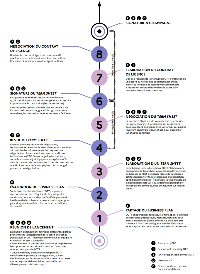 Sans licence, la propriété intellectuelle issue d’un laboratoire de recherche ne peut pas être exploitée commercialement. La licence est donc un outil juridique puissant et incontournable pour mettre sur le marché les produits et services issus de la technologie / du savoir-faire et éviter d'être contrefacteur pour l'entreprise. Une pré-version de ce contrat de licence est souvent appelée "Term Sheet" : c'est un document court synthétisant les principaux accords obtenus à l’issue d’un premier tour de négociation entre l'entreprise et l'OTT. Ce document ne constitue pas un engagement ferme et irrévocable.