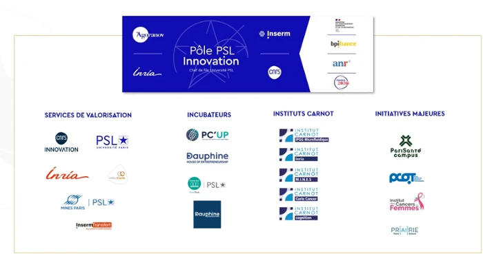 Le Pôle PSL Innovation, regroupant l'Université PSL, le CNRS, l'INRIA, l'INSERM et Agoranov, a pour missions principales de structurer, coordonner et amplifier les actions de valorisation et de transfert de technologie réalisées par les établissements membres et les organismes associés, tout en renforçant les liens et la coopération entre l’Université PSL et le monde socio-économique. L’objectif est de maximiser l’impact de la recherche réalisée par ses communautés.