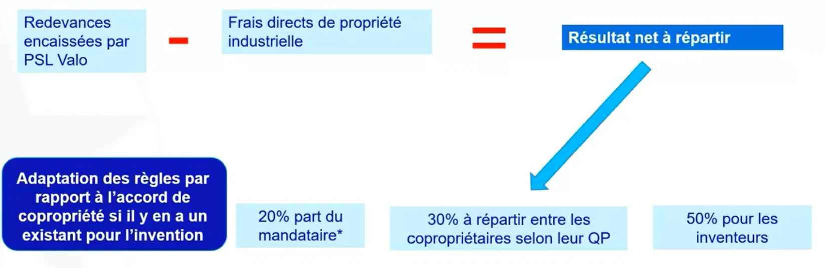 En cas de pluralité d'inventeur·rices, la prime d'intéressement est répartie entre eux en fonction de leur quote-part inventive respective. Elle est attribuée après des mécanismes de partage de la valeur explicités ci-dessous. Il y a souvent une différence entre les revenus bruts perçus et les revenus nets de l'organisme valorisateur, qui retranche des frais engagés pour la protection et valorisation de l'invention.